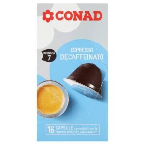 The aroma and taste in a cup arise from a careful selection of the coffee and the right roasting. All the pleasure of an espresso enclosed in a capsule, the perfect combination of quality and practicality. Conad Decaffeinated Espresso Capsules are born from the best variety of coffee, selected and subjected to a natural method of caffeine extraction to maintain the qualities of the bean unaltered while preserving its taste and aroma. Intensity 7 Aroma 7 on 12 Roasting 8 on 12 Body 7 on 12 #Conad Dolce Gusto compatible capsules.Coffee Capsules