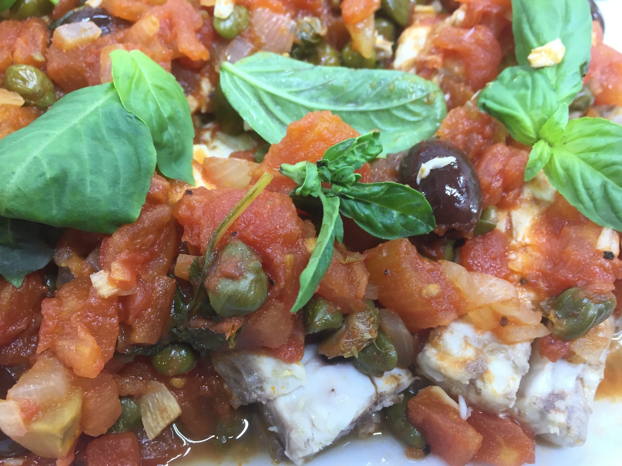 Place the cooked lampuki portions in a shallow dish and pour the hot sauce over them; scatter the fresh basil leaves on top and serve with crusty bread