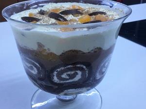 Start building the trifle in a large dish or glass bowl; lay the swiss roll slices across the base and up the sides of the dish; drizzle over half the juice from the mandarins to soak into the sponge; spread the marmalade over the sponge and scatter over half the drained segments; spoon over all of the chocolate custard