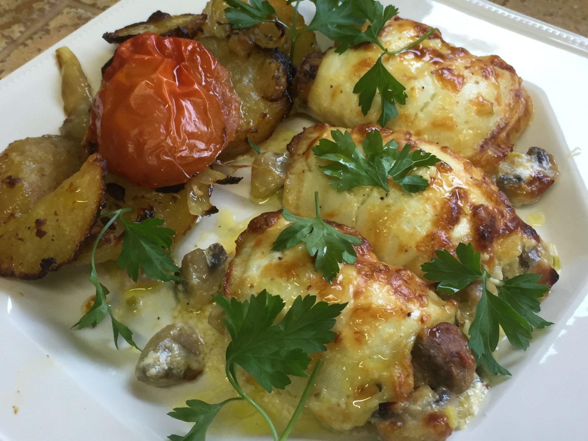 Lay the plaice fillets, skinned side up, on a board; divide the leek mixture between the fillets; fold over to cover the filling and place in the dish