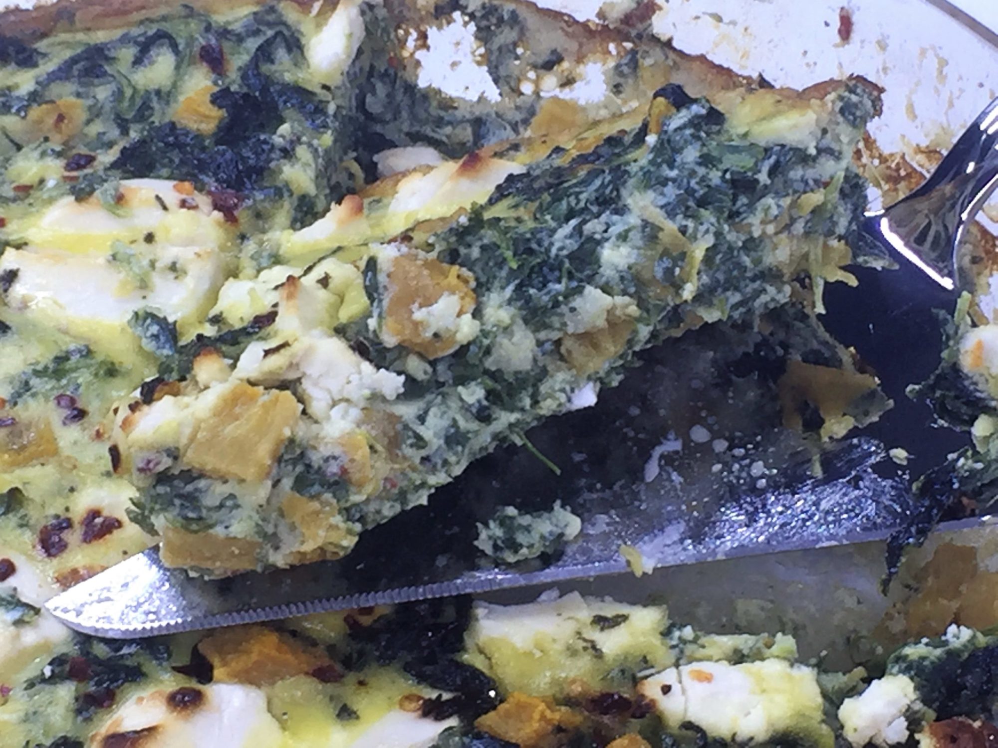 Heat the remaining oil in a frying pan; add the crushed garlic and stir over the heat for 30 seconds, add the spinach and cook, stirring occasionally for 3-4 minutes; tip into the bowl with the egg mixture and stir in the pumpkin