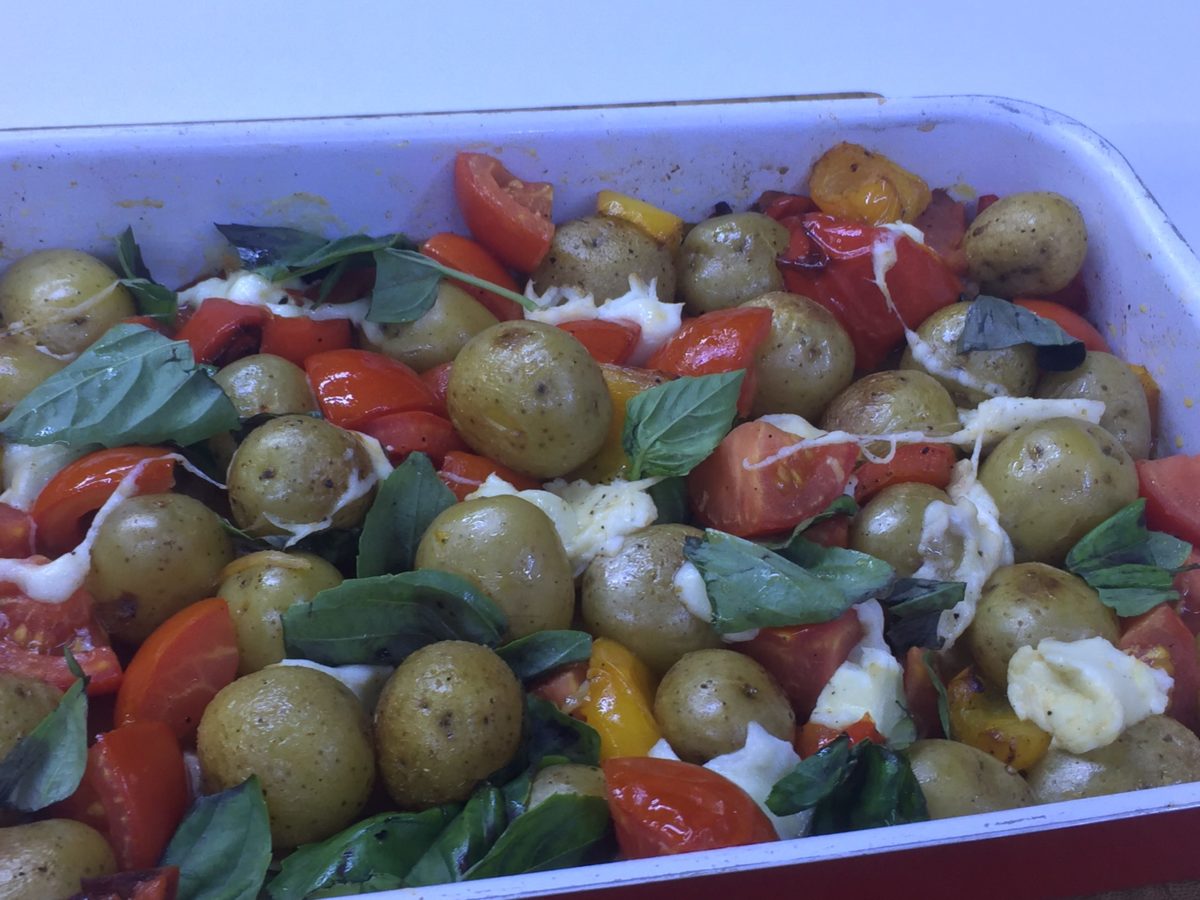 Place the potatoes and peppers in a roasting tin and toss with the garlic, oil and seasoning; place in the preheated oven, roast for 40 minutes, then stir in the tomatoes and sprinkle over the mozzarella
